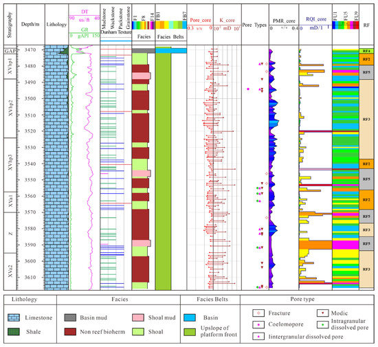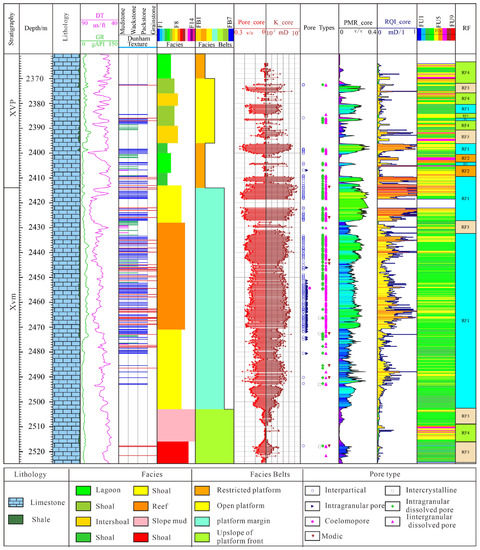 The Dunham classification system [18] as modified by Embry and Klovan [19] was mainly used for sedimentary facies analysis, with reference made to the carbonate sedimentary facies description method proposed by Flügel in 2010 [20]. The vertical division of sedimentary facies and stratigraphic correlation were mainly based on core data and petrophysical logging (mainly using natural gamma-ray GR, sonic differential time DT and density logging RHOB).