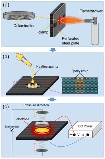 Thermosetting composites offer exceptional durability, good processability, and strength-to-weight advantages; hence, they are ideal for a wide range of composite applications, especially those with rigorous demands, such as aerospace materials [1,2,3]. As an important part of aerospace materials, carbon fiber-reinforced thermosetting composites (CFRTPs), composed of high-performance carbon fibers embedded in a thermoset matrix, have dominated in fabricating aerostructures due to their superior specific strength and stiffness along with favorable corrosion and fatigue resistance [4,5,6]. Facing complex service environmental conditions, CFRTPs are susceptible to low-velocity impacts which can induce internal damages barely noticed by normal visual inspections [7,8]. These internal damages manifest in indentation, matrix cracking, interface debonding, and delamination [9,10], among which delamination occurring between layers of inner structure results in a sharp drop of compression strength, and its propagation causes material failure [11,12]. Therefore, repairing delamination is critical for ensuring the in-service safety of CFRTPs, and, for practical applications, a proper repair process should be easy to handle and cost-effective [13,14].