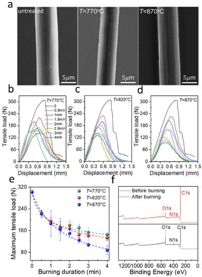 Properties of burned CF yarn. (a) SEM images of pristine and burned CFs. Load–displacement curve of CF yarns heated at (b) 770 °C, (c) 820 °C, and (d) 870 °C for different durations. (e) Maximum tensile load vs. burning duration. (f) XPS spectra of pristine and CF yarns heated at 870 °C for 4 min.