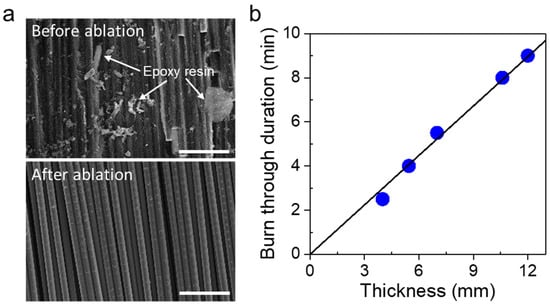 The thermal ablation repair process started with the damage removal followed by matrix reconstruction. The former was achieved by a controlled burning process (Figure 1a), where only resin was carbonized, enabling the continuity of CFs remaining intact. The surface of burned CFs was barely covered with resin, which is confirmed by the SEM images in Figure 3a, which is in contrast to a large amount of epoxy resin distributed on the CFs extracted from the pristine sample (Figure 3a). Experimentally, the resin removal process takes several minutes depending on the damage size. The complete removal can be identified when the panel is burned through on the other side. In our case, the cylinder-like delamination regions had an identical diameter, therefore, the burn-through duration monotonically increased with the panel thickness as shown in Figure 3b. In detail, the burn-through duration increased from 1 to 9 min as the panel thickness increased from 2.5 to 12 mm, the relationship between which is well captured by the linear function with a slope of 0.74.