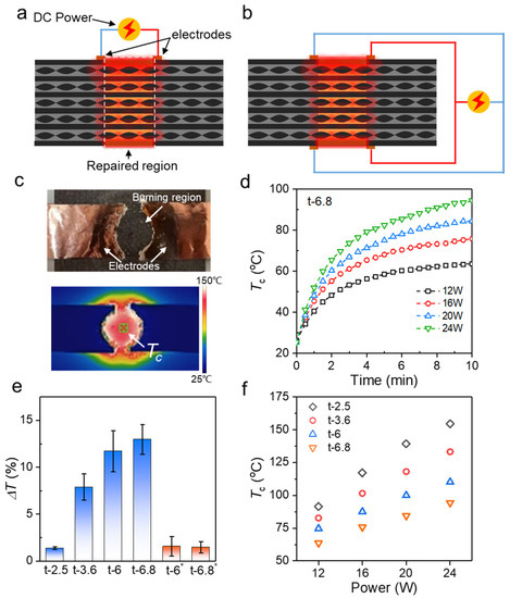 The thermosetting resin, TECHSTORM 481, was used as a healing agent given its low viscosity and thermal stability. Its curing temperature, T = 80 °C, was realized by means of the electric resistance heating method as shown in Figure 4a,c. Two copper foil arcs, acting as electrodes for generating heat, were placed surrounding the damaged region at the top surface (Figure 4a), the temperature of which, estimated by the thermal imager, is uniformly distributed in Figure 4c. The temperature at the center (Tc) of the damaged region increases with increasing electrothermal heating duration and supply powers in Figure 4d and Figure S7. For all samples, Tc was largely enhanced by 200–500% in the first 100 s of heating, and then its increase became smooth with Tc reaching a plateau as heating time > 300 s. The plateau temperature Tp was in the range of 60–160 °C, which increases with the increasing supply power and decreasing panel thickness in Figure 4f. For each thickness, Tp =80 °C, the curing temperature, was achieved by adjusting the magnitude of supply power, as listed in Table S3. For instance, for the t-2.5 sample, T = 80 °C was obtained when the supply power was 10.5 W. Along the thickness direction, the temperature distribution was evaluated by the relative temperature difference between the top and bottom surfaces, , as shown in Figure 4e, which exhibits a strong thickness dependence. As the thickness was below 3.6 mm (t-2.5 and t-3.6 samples), ΔT was well below 10%, the acceptable experimental error, while it largely increased to ~13% as the panel thickness reached 6 mm, due to probably the poor thermal conductivity along the thickness direction. To compensate the poor heat transport ability, we add an additional pair of electrodes at the bottom surface for heat generation in Figure 4b. This strategy significantly reduces ΔT from ~13% to ~2% for both t-6 and t-6.8 (Figure 4e), providing an efficient heat generation approach for samples with large thicknesses. Increasing curing temperature can significantly reduce the resin curing [38] and hence the whole repair process duration. Compared with the typical scarf and inject repair methods that take 2–5 days when performed at room temperature [21,38,39], the repair duration within one hour is relatively fast.