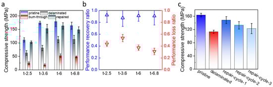 (a) Compressive strength of the panels with four thicknesses under different statues. (b) Performance recovery ratio and loss ratio as a function of sample thickness. (c) Compressive strength of a t-6.8 CF/epoxy panel under three delamination–repair cycles.