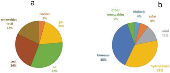 (a) Global production of energy in 2019 and (b) global production of energy from renewables in 2019 [1].