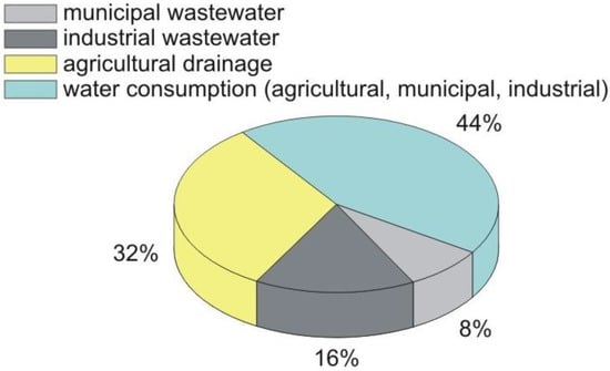 According to United Nations Educational, Scientific and Cultural Organization (2017), the total water withdrawal can be estimated at 3928 km3 per year [26]. Globally, wastewater produced from municipal and industrial activity accounts for 24% of this amount, as illustrated in Figure 2. Municipal wastewater contains wastewater discharged from residences, institutions and public facilities and has a typical COD range of 300–900 mg/L. In 2019, the global production of municipal wastewater exceeded 305 × 109 m3, and the two largest producers were the USA (over 60 × 109 m3) and China (over 40 × 109 m3) [27]. Municipal wastewater is usually treated with the use of activated sludge (AS)—the most common biological method of wastewater treatment—which utilises microorganisms for organic matter decomposition in aerobic conditions. The AS process requires intensive aeration, which makes 55–90% of the energy consumed in the treatment plant [28]. Typically, AS consumes 0.3–2.1 kWh/m3 of energy, with higher values in small plants, but it usually does not exceed 1 kWh/m3 [29,30,31,32]. Thus, we can estimate that municipal wastewater treatment on a global scale requires ca. 300 TWh of energy.