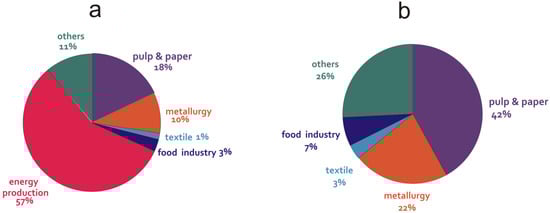 Industrial wastewater includes effluents generated by various branches of industry at all stages of production and accompanying processes, including cooling or installation cleaning (Figure 3). According to the European Environmental Agency, industrial wastewater can be divided into two main categories: the manufacturing and energy supply industries [33]. Among manufacturing industry wastewater, there are effluents from the production of iron and steel, non-ferrous metals, non-metallic minerals, pulp and paper (P&P), chemicals, food and drink and other manufacturing activities. In the energy industry category, wastewater is generated in mining, the extraction of gas and oil, power plants and refineries. Based on AQUASTAT and the United Nations report (2017), industrial wastewater production in 2019 was ca. 630 × 109 m3, which accounts for 16% of total global water withdrawal [26,34,35]. Similar to the case of municipal wastewater, two of the world’s highest water consumers, which use 50% of global water for industrial purposes, are the USA (209.7 × 109 m3) and China (133.5 × 109 m3) [26]. Depending on the sector type, industrial wastewater is discharged or treated and re-used in place. For example, the Danish brewer Carlsberg claims to recycle 90% of the water used in its plants [36]. Conversely, in paint production, which uses up to 3.2 × 105 m3 of water per day, only 4% of water is recycled [37]. Large-scale industries account for a significant proportion of the direct release of wastewater (e.g., the energy supply industry, which accounts for ca. 86%) [38]. According to a United Nations report, ca. 80% of wastewater globally is discharged without sufficient treatment [25]. Industrial wastewater is much more diversified in terms of its degree of pollution than municipal wastewater. The COD values of industrial wastewater are quite diverse between different sectors and within particular branches (Table 1). Obviously, a higher contamination level of industrial effluents requires more energy for treatment. A case study of dairy wastewater treatment with the use of AS showed that energy consumption was 0.9–1.2 kWh/m3 when the COD of wastewater was 1900 mg/L, and it increased to 1.3–1.5 kWh/m3 when the COD was 3700 mg/L [39]. Similar to municipal wastewater, AS is the technique of first choice for industrial effluents. However, AS often requires more advanced treatment methods when efficiency is unsatisfactory, especially for wastewaters with high COD loadings. The most efficient treatment techniques, such as membrane methods, need 1–6 kWh/m3, which can obtain a COD removal efficiency >90% and reduce the production of sludge by as much as five-fold during treatment compared to AS [23,40]. In cases in which heavily polluted wastewater needs to be treated, the most effective electrochemical methods can consume as much as 153 kWh/m3 [41].