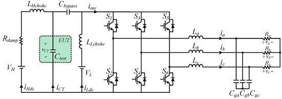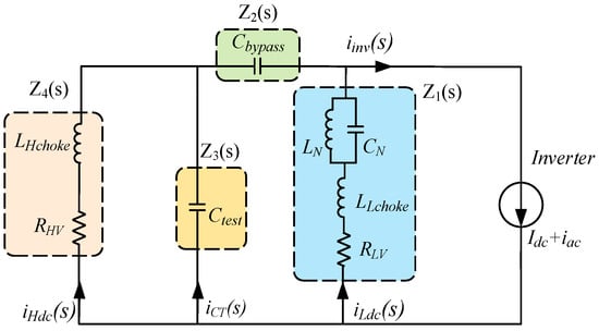In order to analyze the proposed evaluation system shown in Figure 3, an equivalent circuit focusing on the inverter current iinv and DC side currents is introduced in Figure 4, where the low-voltage DC supply VH and high-voltage DC supply VL are set to zero. The current iinv can be seen as the current source and expressed as the sum of the DC component Idc and the AC component iac. The AC current iac includes high- and low-frequency components. The LLchoke and LHchoke are the choke inductors in the low-voltage DC side and high-voltage DC side, respectively. The RLV and RHV are the equivalent series resistance corresponding to the low-voltage DC side and the high-voltage DC side circuit branches, respectively. Note that the damping resistor Rdamp is added into the RHV. For the convenience of discussion, we assume Z1 and Z4 are the total impedance in the low-voltage DC side and the high-voltage DC side circuit branches, respectively. The Z2 and Z3 are the impedance of the bypassing capacitor Cbypass and capacitor Ctest under test, respectively. Therefore, the impedances Z1 to Z4 can be written as follows: