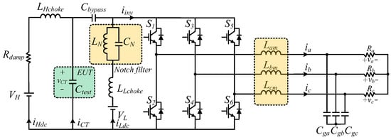 Therefore, an improved down-scale voltage rating evaluation system for DC-link capacitor is proposed in Figure 3. Compared with Figure 2, the three-phase inductors are changed and a notch filter is adopted in the low-voltage DC supply path. It should be noticed that, in order to block the high-frequency ripple current produced by the PWM inverter to flow through the high-voltage DC supply VH and low-voltage DC supply VL, the reactance of the two choke inductors must be much larger than that of Ctest and Cbypass, as follows