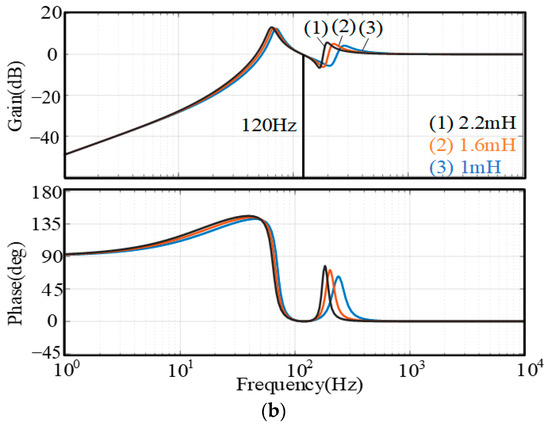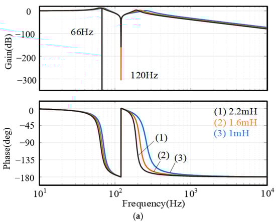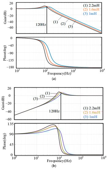 where CS is the equivalent series capacitor in the Z2 and Z3 circuit branch. In the following, the choke inductor LLchoke is discussed under three different inductor values, namely 1 mH, 1.6 mH, and 2.2 mH. The bode plots of G3 and G4 in the conventional evaluation system are shown in Figure 5a,b, respectively. Note that, in the system, CS and LLchoke will form an LC resonant circuit. For the worst case, when the inductance value of the choke inductor LLchoke is 1.6 mH, the second-order harmonic current, i.e., 120 Hz, will exactly fall on the peak resonance, where the gain of the transfer function is at the maximum. In this case, it will seriously influence the current iCT under test because the second-order current will not only flow into iLdc, but also be amplified due to the LC resonance. To solve this problem, a filter is adopted and added to the low DC voltage side circuit branch, shown in Figure 3, to block the second-order harmonic current and change the resonance situation. For the improved system in this paper, G3(s) and G4(s) are given as Equations (15) and (16), respectively. The bode plots of G3(s) and G4(s) in the improved evaluation system are shown in Figure 6. Different from that shown in Figure 5, the gain of the transfer function G3(s) at 120 Hz is much smaller. Thus, it can be seen from Figure 5 and Figure 6 that, for the 120 Hz ripple current, the impedance of Z1 is high enough to block it. Moreover, the peak resonance point is set to 66 Hz, as shown in Figure 6a. Note that, under the load-unbalanced condition, iac does not contain the ripple currents whose frequencies are below 120 Hz. Figure 6b shows the bode plot of the transfer function G4(s). No matter what inductance value of LLchoke is selected, the gain of G4(s) stays at 0 dB at 120 Hz and at the switching frequency, which indicates that the AC component of the capacitor current iCT is equal to the ripple current flowing from the down-scale and full-scale voltage rating inverter under the unbalanced load condition.