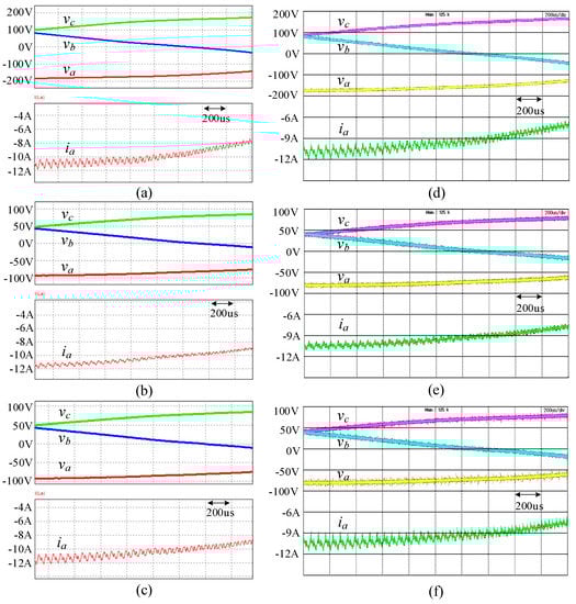 Figure 7a–c and Figure 7d–f shows the simulation and experimental results of the output voltages Va, Vb, Vc, and the output inductor current ia, respectively. Due to the power rating of the down-scale voltage rating VSI being half that of the full-scale voltage rating VSI, it can be seen from Figure 7 that the output inductor values of the down-scale voltage rating VSI must be modified to half that of the full-scale voltage rating VSI, so that the amplitude of the line current ripple in the down-scale voltage rating inverter is very close to that in the full-scale inverter. Table 3 and Table 4 show the simulated and measured peak-to-peak current ripples at the maximum phase voltage, respectively. As can be observed from Table 3 and Table 4, one can see that the amplitude of the current ripple in the proposed down-scale voltage rating evaluation system has a value closer to that of the full-scale voltage rating VSI, when compared with the conventional down-scale voltage rating evaluation system.