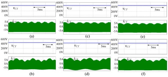 The simulated voltage vCT and current iCT of the DC-link capacitor under test for (a,c,e) balanced and (b,d,f) unbalanced load condition in the (a,b) full-scale voltage rating VSI, (c,d) conventional down-scale voltage rating evaluation system, and (e,f) proposed down-scale voltage rating evaluation system.