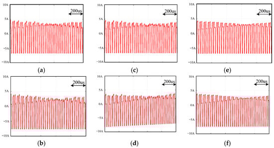 The enlarged view of simulated current iCT of the DC-link capacitor under test for (a,c,e) balanced and (b,d,f) unbalanced load conditions in the (a,b) full-scale voltage rating VSI (c,d), conventional down-scale voltage rating evaluation system, and (e,f) the proposed down-scale voltage rating evaluation system.