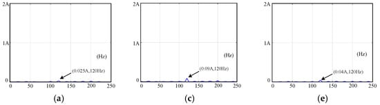 In order to clarify the difference in the capacitor evaluation results, the corresponding enlarged view of the simulated current iCT of the DC-link capacitor under test is illustrated in Figure 9. It follows from Figure 9 that, under the balanced load condition, the conventional and proposed down-scale evaluation systems can obtain a similar DC-link capacitor current under test compared with the full-scale voltage rating VSI, but it is different under the unbalanced load condition. In addition, the corresponding close-to-120 Hz FFT results of the simulated iCT of the DC-link capacitor under test are shown in Figure 10. As can be seen from Figure 10, under the balanced load condition, the amplitude of the double-line frequency in the full-scale voltage rating VSI, conventional down-scale voltage rating evaluation system, and proposed down-scale voltage rating evaluation system is very close to zero. However, under the unbalanced load condition, the amplitude of the double-line frequency in the conventional down-scale voltage rating evaluation system is much different from that in the full-scale voltage rating VSI.
