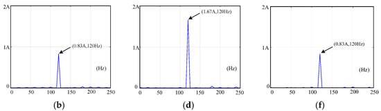 Close-to-120 Hz FFT results of current iCT of the DC-link capacitor under test for (a,c,e) balanced and (b,d,f) unbalanced load conditions in the (a,b) full-scale voltage rating VSI, (c,d) conventional down-scale voltage rating evaluation system, and (e,f) proposed down-scale voltage rating evaluation system.