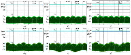 The measured voltage vCT and current iCT of the DC-link capacitor under test for (a,c,e) balanced and (b,d,f) unbalanced load conditions in the (a,b) full-scale voltage rating VSI, (c,d) conventional down-scale voltage rating evaluation system, and (e,f) proposed down-scale voltage rating evaluation system.