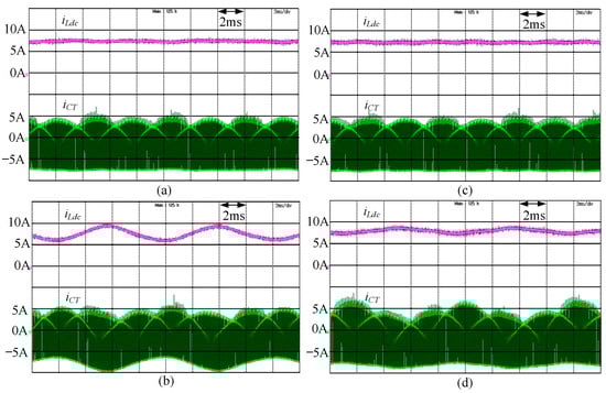 Next, by analyzing the iLdc and iCT, one can observe the problem of the previous system [] in Figure 11. Figure 11b shows that, when the three phase loads are unbalanced, the double-line frequency or second-order harmonic current will flow into iLdc and be amplified by an LC resonant circuit loop. As shown in Figure 11d, the proposed down-scale voltage rating evaluation system can block the second-order harmonic current in the low-voltage DC-side iLdc circuit branch and change the LC resonant circuit loop. Figure 12 and Figure 13 are the experimental results corresponding to the simulation results in Figure 8 and Figure 11, respectively. As can be observed from Figure 8, Figure 11, Figure 12 and Figure 13, the experimental results are in very close agreement with the simulation results. Both the simulation and experimental results verify the validity of the proposed down-scale voltage rating evaluation system.