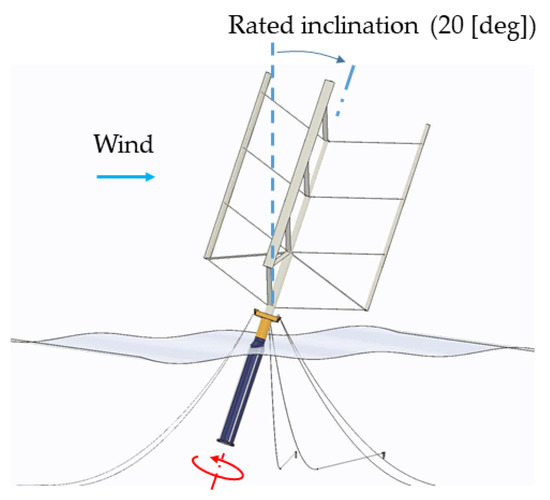 Akimoto et al. proposed a floating offshore wind turbine (FOWT) concept, called the floating axis wind turbine (FAWT), that uses a VAWT to reduce power generation cost [15]. There are several types of FOWT that use vertical axis wind turbines, including semi-submersible [16,17] and spar [18,19]. In Akimoto’s concept, the latter was adapted to actively utilize the features of VAWTs, such as the low center of gravity and the fact that the power coefficient of VAWTs is difficult to decrease compared to that of HAWTs if the turbine tilts. A straight-blade VAWT is attached to a spar and they rotate together. Power take-off units are installed on the spar above the water’s surface, and the unit is moored so as to keep the position of the FAWT and absorb the reaction torque resulting from power generation. The smaller spar is all that is required for FAWTs because it assumes rotor axis tilt, which reduces construction costs. As a result, it is critical to assess VAWT performance under tilted conditions. Figure 1 depicts the conceptual diagram of the FAWT.