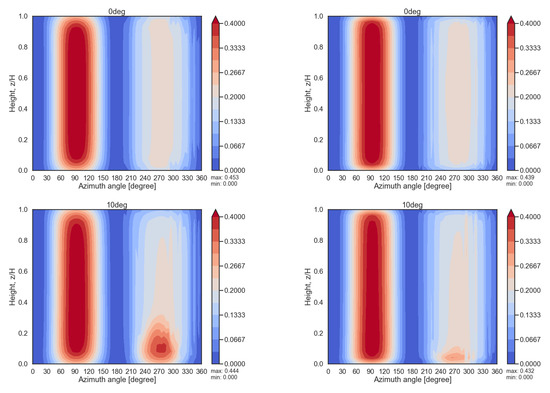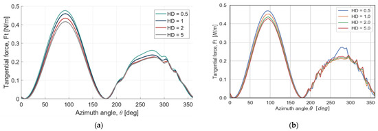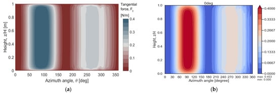 Figure 4 depicts tangential blade forces as a contour graph with respect to the azimuth angle and blade height. This turbine is a 1.0. It is the same as Figure 3 in the sense that azimuth angles 0~180 and 180~360 [deg] indicate upwind and leeward sides of the blade’s position, respectively, and wind comes from 90 [deg]. The tangential force is symmetric in a blade spanwise direction, and the ground effect is not taken into account in these simulations. There is no discernible difference between Figure 4a,b.