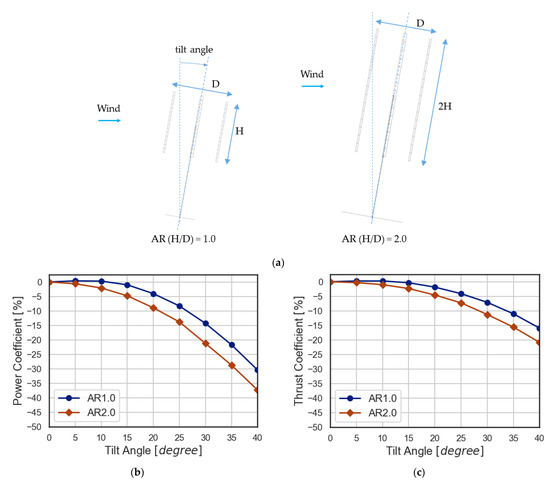 A FAWT is built with the assumption that its rotor will be at a 20-degree tilt underrated operation; and for Model 2 were estimated to assess the tilt effect on VAWT performance. The values are shown in Table 4, and Figure 5 depicts the differences in the upright condition. These results show that the power coefficient slightly increases at a 10-degree tilt for a rotor with a 1.0 aspect ratio. The decrease in at a 20-degree tilt is only 4% from the upright condition. This is because the swept area of the VAWT increases when the rotor tilts to some extent [35]. Concerning the rotor with 2.0 aspect ratio, the decrease in performance at a 20-degree tilt is 10% from the upright condition. The decrease in performance for the 2.0 aspect ratio is larger than that for the 1.0 aspect ratio. This is explained by the fact that the rotor radius contributes to the increase in swept area, which becomes relatively small as the aspect ratio increases.