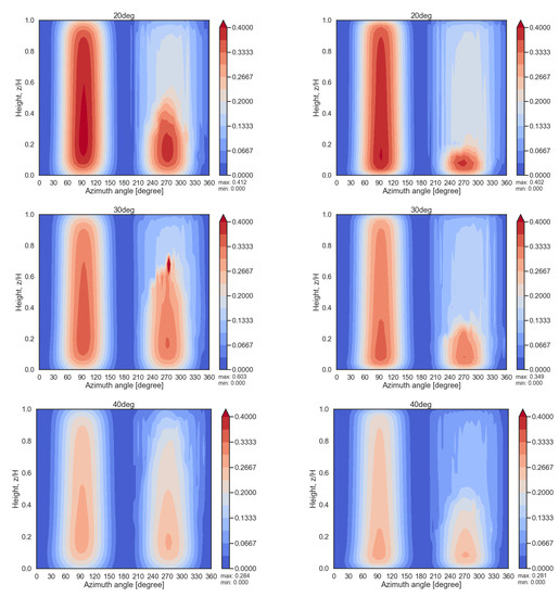 Figure 6 depicts the tangential blade forces as a contour graph in relation to the azimuth angle and blade height. Because the blade height is normalized, the height effect appears in a 2.0 aspect ratio. These figures depict that in the case of a tilted rotor, the lower part of the rotor on the leeward side effectively obtains energy from wind. Under the upright condition, wind velocity on the leeward side decreases from the top to the bottom of the blade height. Meanwhile, when the rotor is in the tilted condition, the wind velocity on the lower part of the rotor on the leeward side stays strong because the blade does not pass the wind on the upwind side. Then, the lower part of the rotor obtains energy from the wind on the leeward side. Even though the smallest part of the rotor can effectively generate the tangential force on the leeward side, the airfoil performance degrades with increasing rotor tilt angle. This may be indicated in the results of the 30- and 40-degree-tilt tests. Based on these findings, it stands to reason that the FAWT rotor is at a 20-degree tilt under the rated operation.