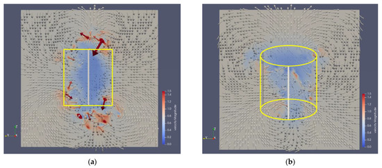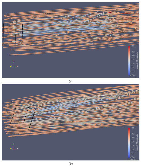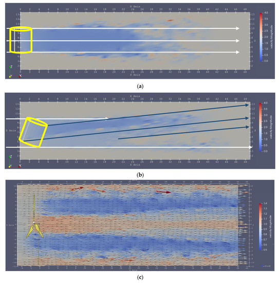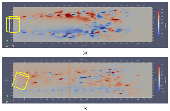 Figure 8 depicts the vertical component of wind velocity corresponding to Figure 7. The colors red and blue represent the upward and downward velocity components, respectively. Compared to the flow field of an upright VAWT, the upward velocity component may be seen just behind the rotor, as opposed to the flow field of an upright VAWT. The orange lines denote the position at four times the rotor diameter’s (D) distance from the rotor center, and Figure 9 depicts the wind velocity vector in the YZ-plane at that location. The yellow circular cylinder represents the rotor’s position, which is located 4D anteriorly. The color of the contour indicates the magnitude of the velocity in this plane. The colors blue and red represent low and high velocity, respectively. There are upward and downward vectors at the top and bottom of the rotor in both cases. Then, the vectors head into the center region from both sides of the top of the rotor. Figure 10 depicts 3D streamlines of an upright and 20-degree-tilted VAWT. In these figures, the blades of the rotor are shown in black. Under the upright condition, most of the streamlines behind the turbine go straight to the leeward side. On the other hand, the streamlines go obliquely upward under the 20-degree-tilted condition. These results indicate that the momentum is being transferred between the lower- and the higher-velocity region. As a result, the wind velocity at rotor height recovers to its initial velocity faster than that of a HAWT. This allows us to install VAWTs in a dense manner.