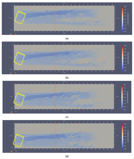 Magnitude of in-plane wind velocity behind a 20-degree-tilted VAWT with different ground clearance: (a) 1.0D; (b) 0.8D; (c) 0.6D; (d) 0.4D.