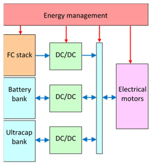 To manage the flow of electrical energy delivered by the FC, the battery, and the ultracapacitor stacks, a power electronics controller is used. Management of the energy exchange between the battery, the ultracapacitor, and the FC, i.e., deciding whether to use the stored electricity or generate it with the FC system, is an important challenge. This strategy affects the required battery power and optimal ultracapacitor sizing [44,45]. Paper [4] introduces different energy management strategies leading to the improvement of the performances from both the energy and reliability points of view. In addition to assessing fuel consumption, several control strategies prevent the degradation of energy storage systems represented by batteries and ultracapacitors [41].