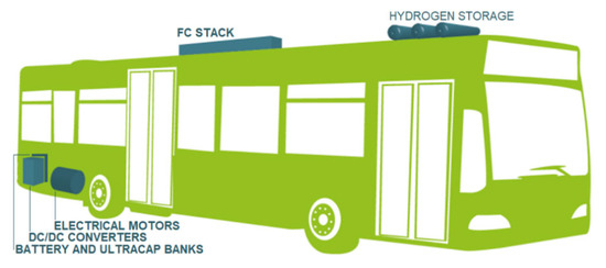 Hydrogen is usually stored on board the bus either as compressed gas (200–1000 bar) in tanks, or as a cryogenic low-temperature (−253 °C) liquid, or even in an atomic state reversibly adsorbed in metal hydrides [10]. High-pressure tanks located on the roof of the bus provide sufficient range for a full-day operation, over 16 to 18 h [18]. In [49], Brazilian FCEBs with a driving range between refueling of 300 km are described. Korean Elec City FCEB has two hydrogen FCs stacks with a capacity of 90 kW [50]. Ballard’s Fébus FCEB presented in [18] covers more than 300 km between hydrogen refueling. Another Ballard bus carries near 40 kg of hydrogen onboard and is able to travel 350 km throughout the day.