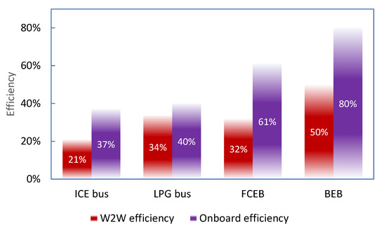 Figure 7 roughly demonstrates different efficiency estimates of the four types of buses. It is considered that a diesel bus normally consumes 19–24 L per 100 km [80,81] and a bus propelled by LPG consumes 10–15% more, that is, 21–27 L. These data are reasonable for high-density traffic in urban areas, but surely not for long-mileage cruises.