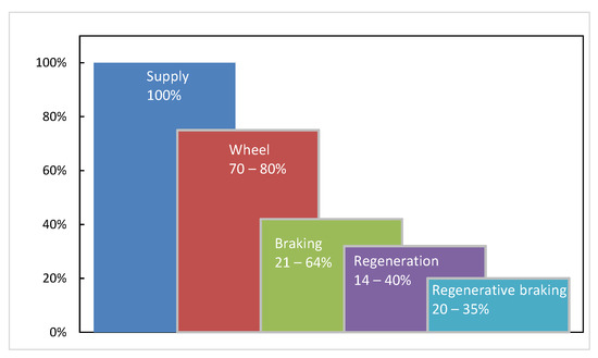 Variable losses are also associated with power converters and driven wheels [82]. As for losses related to the so-called “well-to-tank” chain, there are also many examples of changing efficiency.