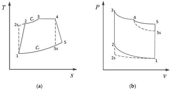 Finite time thermodynamics (FTT) [1,2,3,4,5,6,7,8,9,10,11] has attained significant progress in recent years. Many scholars have applied FTT to research performances of thermodynamic cycles, including optimal performance studies [12,13,14,15,16,17,18,19,20,21,22,23,24,25,26,27,28,29] and optimal path studies [30,31,32,33,34,35,36,37,38,39,40,41,42]. Early research work on the internal combustion engine cycles mainly focused on thermal efficiency () and power output () under the condition of constant specific heat (SH) of working fluid (WF) [43]. When actual heat engines are working, the change in SH of WF is very complicated. In order to study the effects of the SH of WF changing with temperature, which is closer to engineering practice, some scholars have put forward linear [44] and nonlinear [45] models of SH of WFs varying with temperature. In addition to considering the effects of the WF’s SH characteristics on the performances of thermodynamic cycles, it is crucial to take into account the influences of different losses and different objective functions (OFs) on the cycle performance. Common loss models include heat transfer loss (HTL) [43], internal irreversibility loss (IIL) [46], and friction loss (FL) [47]. Common OFs include and [48], ecological function () [49], power density () [50], efficient power () [51], etc.