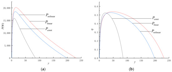 Figure 7 shows the comparisons of and of irreversible PM cycle with constant SH (, ), with linear variable SH (,), and with nonlinear variable SH (,). The performance indicators for the former two cases are shown in and Appendix B.