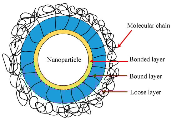 With the development of nanotechnology, it has been found that the uniform dispersion of a low number of nanoparticles in polymers can significantly improve the electrical properties of the material [,], which is believed to be related to the interfacial region formed between the nanoparticles and the polymer matrix [,]. The interfacial region changes the distribution, relaxation, and free volume of the polymer molecular chains, which have significant effects on the charge injection barrier, charge trap depth, and trap density [,], and in turn changes the space charge characteristics of the material. Some scholars have proposed different models to describe the properties of nanocomposites based on experiments and theoretical analysis and one of the most representative is the multi-core model proposed by T. Tanaka []. As shown in Figure 1, according to the multi-core model, the interfacial region between nanoparticles and the polymer matrix consists of three layers: the innermost layer is the bonded layer, the middle layer is the bound layer, and the outermost layer is the loose layer. The ability of each layer to trap charges is different, and the depth of the charge trap gradually decreases from the inner layer to the outer layer. Studies have shown that adding an appropriate amount of nano-MgO to XLPE can improve the space charge characteristics of the material to a certain extent [,,,,]; however, its effects on the space charge characteristics—especially the interfacial charge characteristics of the composite insulation composed of XLPE and EPDM at the actual HVDC cable joint—are not clear.
