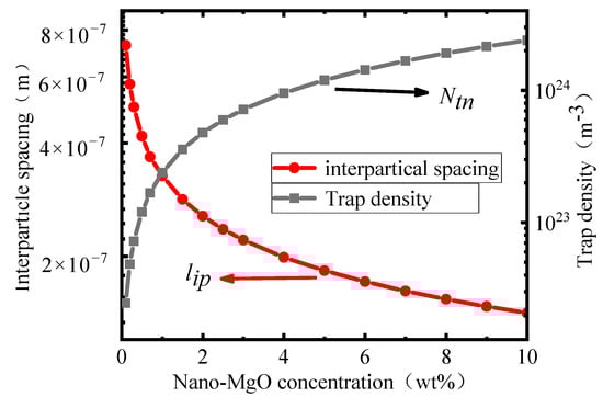 It can be seen from Equations (4)–(6) that with the increase of the nano-MgO concentration, the spacing between nanoparticles decreases significantly, leading to the increase of the deep trap density, and the specific calculation results are shown in Figure 2.