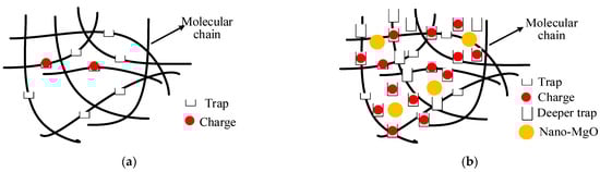 The trap and charge distribution in the material before and after nano-MgO addition: (a) pure XLPE; (b) MgO/XLPE.