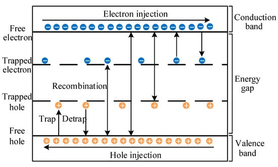 The charge injection at the electrode can be described by Schottky’s equation when the electric field is below 100 kV/mm []. The charge transport inside the material can be described by the continuity, Poisson, and conduction equations []. The trapping, detrapping, and recombination of charges cause the density of the charge transport to change and this process can be described by the charge source term []. Due to the space limitation, the specific equations are not presented here.