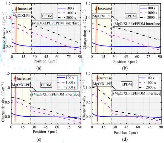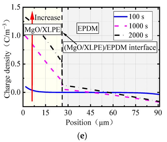 As can be seen in Table 1, when the nano-MgO concentrations were 0 and 0.1 wt%, the deep trap depth of MgO/XLPE gradually decreased with the increase of nano-MgO concentration and was always lower than that of EPDM, so the holes can cross the (MgO/XLPE)/EPDM interface and can migrate deeper into EPDM, resulting in a higher charge density on the MgO/XLPE side than on the EPDM side of the interface, and the charge density difference can gradually decrease. When the nano-MgO concentrations were 1.0 and 2.0 wt%, the deep trap depth of MgO/XLPE gradually increased with the increase of concentration and was higher than that of EPDM. As can be seen in Figure 2, the deep trap density also gradually increased under this condition, so a high number of holes accumulated in MgO/XLPE, causing the charge density on the MgO/XLPE side of the (MgO/XLPE)/EPDM interface to be higher than that on the EPDM side. At the same time, the migration range of holes in EPDM reduced, leading to a gradual increase in the charge density difference between the two sides of the interface. For the case where the nano-MgO concentration was 0.5 wt%, the deep trap depth was lower than when the concentrations were 0 and 0.1 wt%; however, the deep trap density was much higher in the former. As a result, the charge density on the MgO/XLPE side of the (MgO/XLPE)/EPDM interface is slightly higher than that on the EPDM side when the concentration is 0.5 wt%.