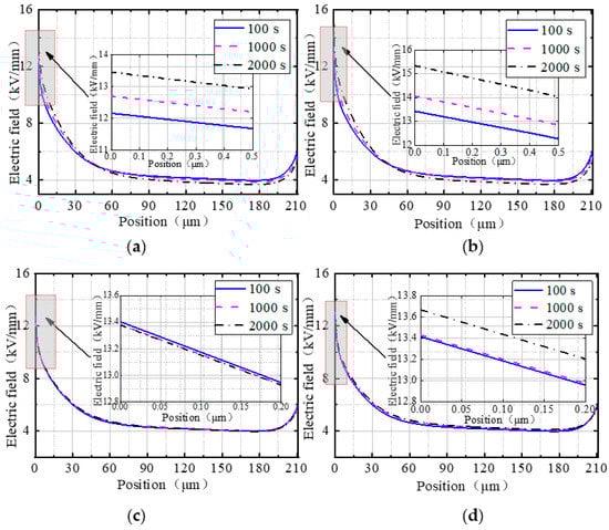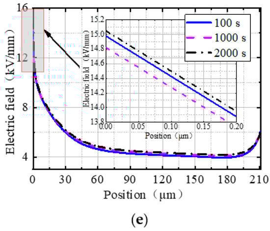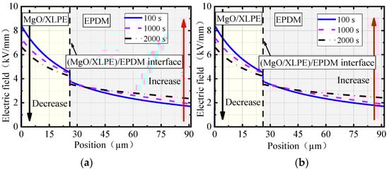 Figure 7 shows the electric field distributions in the radial direction in the cable joint at different polarization times with different nano-MgO concentrations (the horizontal axis in the figure represents line a in Figure 5, and 0 μm and 91 μm represent the endpoints A and B on both sides of line a, respectively). In the figure, it can be seen that the electric field distribution in the cable joint shows an overall downward trend. The electric field in the cable insulation MgO/XLPE is higher, while that in the joint insulation EPDM is lower, and the electric field variation in EPDM is smoother than that in MgO/XLPE. Due to the space charge accumulation, the electric field changed abruptly at the intermediate interface.