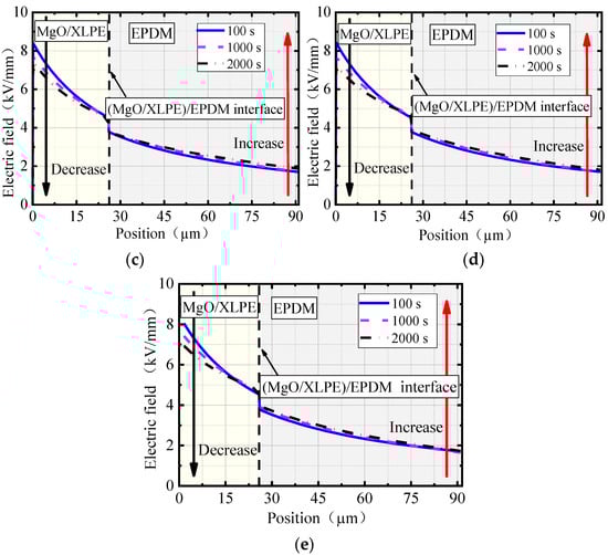 Electric field distributions at the (MgO/XLPE)/EPDM interface with different nano-MgO concentrations: (a) 0 wt% nano-MgO; (b) 0.1 wt% nano-MgO; (c) 0.5 wt% nano-MgO; (d) 1.0 wt% nano-MgO; (e) 2.0 wt% nano-MgO.