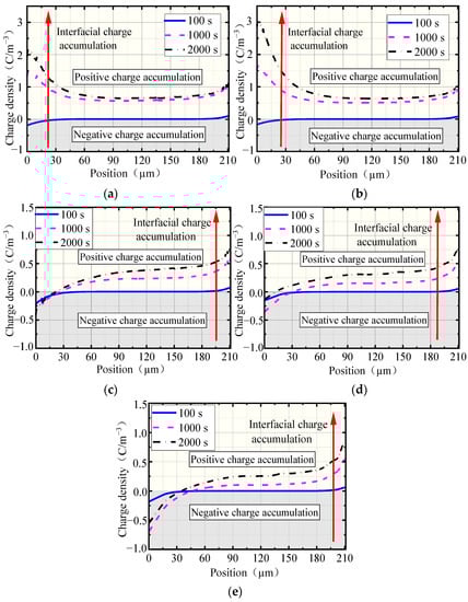 The radial space charge density distributions in the cable joint with different nano-MgO concentrations: (a) 0 wt% nano-MgO; (b) 0.1 wt% nano-MgO; (c) 0.5 wt% nano-MgO; (d) 1.0 wt% nano-MgO; (e) 2.0 wt% nano-MgO.