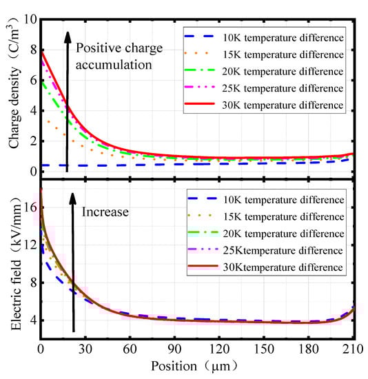 In order to more comprehensively reflect the space charge and electric field distribution characteristics inside the cable joint when the nano-MgO concentration is 0.5 wt%, a simulation of the space charge and electric field distribution under different temperature differences between the inner and outer sides of the joint was carried out. The temperature differences were set at 10, 15, 20, 25, and 30 K. The high voltage shield tube side is the high-temperature side with a constant temperature of 334.5 K and the outer side of EPDM is the low-temperature side with temperatures of 324.5, 319.5, 314.5, 309.5, and 304.5 K, respectively.