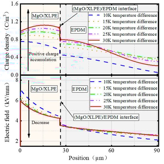 The charge density and electric field distributions at the (MgO/XLPE)/EPDM interface under different temperature differences with nano-MgO concentration of 0.5 wt%.