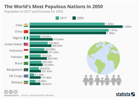 - McCarthy, N. Global Population: The World’s Most Populous Nations in 2050. 2017. Available online: https://www.statista.com/chart/9947/the-worlds-most-populous-nations-in-2050/ (accessed on 13 June 2022).