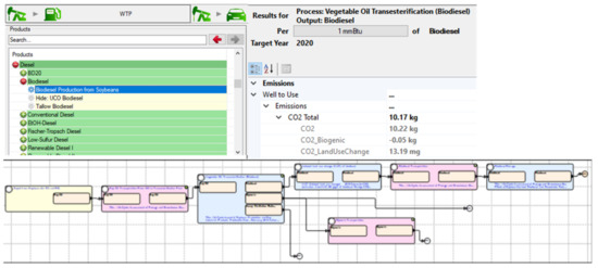 Considering biodiesel production from soybeans using the standard transesterification method (see Figure 4) with a system that includes a farm to grow soybeans, where they are harvested and shipped to a biorefinery, where they are processed and converted into biodiesel. The system also includes biodiesel transportation and storage at the distribution point, where they enter the market. Considering this system, an LCA of biodiesel production using the GREET (greenhouse gases, regulated emissions, and energy use in transportation) software package developed by the U.S. Department of Energy [20] shows that this process generates 10.22 kg CO2 (−0.05 kg Biogenic CO2) per mmBtu of biodiesel [21].