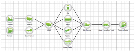Comparing biodiesel production to conventional diesel produced from crude oil, the LCA includes crude supplied from standard oil reserves plus unconventional oil sands and shale oil reserves (see Figure 5). Standard diesel refining technology is assumed to produce conventional diesel, which is then shipped from the refinery to market using various transportation routes (see Figure 6). Considering this system, conventional diesel production is responsible for 12.96 kg CO2 (−0.02 kg Biogenic CO2).