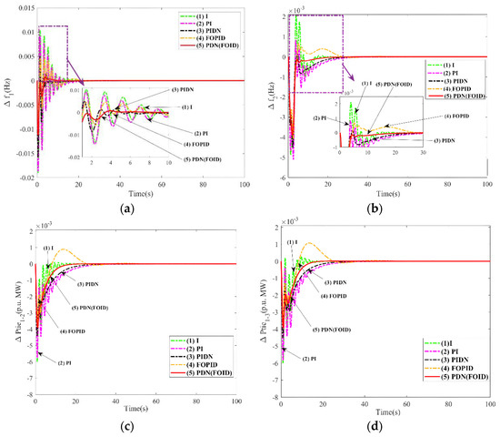 Evaluation of outcomes of subordinate controllers for scheme-1 for 1% step load disorder contrast time: (a) Anomaly of frequency of area-1, (b) Anomaly of frequency of area-2, (c) Anomaly of Tie-line power interlinking area-1 and area-2, (d) Anomaly of Tie-line power interlinking area-1 and area-3.