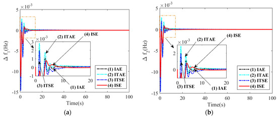 With the help of illustrious values accomplished for PDN(FOID) controller’s gains and correlated parameters in each case, the dynamic responses are contrasted in Figure 6a–c, and the corresponding Pk_O, Pk_U, and S_Time values are marked down in Table 3. A critical view of the responses says that responses considering PiISE as Pi have a better performance compared to others with respect to lessened Pk_O, Pk_U, S_Time, and oscillations. Thus, it is revealed that the SHO-optimized PDN(FOID) controller using ISE as a performance index outperforms other Pi in terms of lessened Pk_O (Δf1 = 0.0007 Hz, Δf2 = 0 Hz, and ΔPtie1–2 = 0 Hz), Pk_U (Δf1 = 0.0112 Hz, Δf2 = 0.0038 Hz, and ΔPtie1–2 = 0.0039 Hz), and S_Time (Δf1 = 25.81 s, Δf2 = 35.31 s, and ΔPtie1–2 = 21.71 s). Further, the values of Pi are PiISE = 0.00021, PiITSE = 0.00084, PiIAE = 0.1053, and PiITAE = 0.7233, which reveals the better performance of the system with PiISE. The convergence characteristics for system-1 using different Pi’s is reflected in Figure 6d. It is observed that convergence characteristics using ISE as Pi converge faster in fewer iterations than other Pi’s.