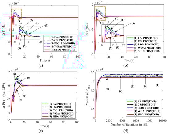For the nomination of the algorithm, system-1 is provided with different algorithms, separately, using PDN(FOID) controllers. The algorithms used here are the firefly algorithm (FA), cuckoo search algorithm (CS) [46], particle swarm optimization (PSO) [47], whale optimization algorithm (WOA), and SHO. The tuned values for FA are β0 = 0.3, α = 0.5, γ = 0.4, count of fireflies = 50, and maximum number of generations = 100. For CS, nests count = 50, rate of discovery = 0.5, exponent of levy = 1.5, maximum generation = 100, and count of dimensions = 10. For PSO, the tuned parameters values are w = 1, wdamp = 0.99, c1 = 1.4, c2 = 1.98, population size = 50, and maximum generation number = 100. For WOA, figure of hunt agents = 50, and number of repetitions = 100. For each of the algorithms, the best values for the PDN(FOID) controller are obtained. The values are not provided here. With these values, the responses of different algorithms are contrasted in Figure 7a–c. The corresponding responses of Pk_O, Pk_U, and S_Time values are given in Table 4. In Table 4, it can be seen that Pk_O, Pk_U, and S_Time values obtained by the SHO-optimized PDN(FOID) controller are much better compared to other algorithms. Thus, it is revealed that the SHO-optimized PDN(FOID) controller outperforms other algorithms in terms of lessened Pk_O (Δf1 = 0.0007 Hz, Δf3 = 0 Hz, and ΔPtie1–3 = 0 Hz), Pk_U (Δf1 = 0.0112 Hz, Δf3 = 0.0052 Hz, and ΔPtie1-3 = 0.0039 Hz), and S_Time (Δf1 = 25.81 s, Δf3 = 23.53 s, and ΔPtie1–3 = 21.04 s). Further, the supremacy is judged by the convergence curve provided in Figure 7d, where it is observed that the response with the SHO-optimized PDN(FOID) controller converges faster and has the least value of PiISE. Therefore, further analyses are carried out using the SHO algorithm.