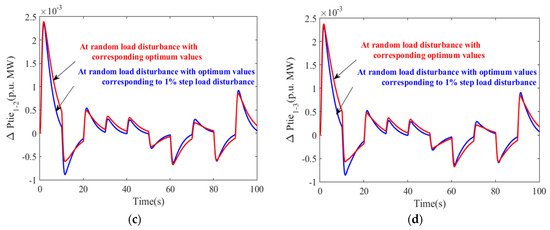The exploration of sensitivity is executed to perceive the heftiness of SHO-augmented PDN(FOID) controller gains traced at the basic event to comprehensive variance in the structure state of the thermal–bio-diesel–WavePPt in area-1, thermal–GPP in area-2, and thermal–Ss (GT)–PV in area-3 schemes along with CES with duple compensation. Here, the inspected scheme is stated with a random pattern of disturbance from a basic 1% step load disturbance. The augmented gains of the PDN(FOID) controller reflected in Table 10 are attained by retaining the SHO. The dynamic outcomes for the finest values analogous to the foundation and diverse outcomes are distinguished in Figure 12. In Figure 12a–d, it is indicated that all responses obtained with optimized values for the proposed controller (from Table 9) are stable for random load disturbance. Evaluation affirms that the outcomes are moderately identical, which claims that there are no circumstances for the added retuning of the finest values for modification.