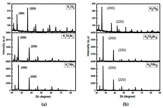 XRD studies of K2TiBr6, K2TiI6 and K2TiI2Br4 perovskites are given below in Figure 1a. All three perovskites have face centered cubic structure with Fm3¯m space group [32,33]. Based on the theoretical studies [32,33], the lattice constants of K2TiBr6 and K2TiI6 are 10.50 Å and 11.42 Å respectively. Values calculated from XRD pattern using Bragg’s law for K2TiBr6, K2TiI6 perovskites are a = 10.47 Å, 11.40 Å, agreeing closely to the theoretical values mentioned above. By Vegard’s law, lattice constant of K2TiI2Br4 is approximately a weighted mean of K2TiBr6 and K2TiI6, hence a = 10.965 Å. Lattice parameters calculated from the XRD pattern have descending values in the order K2TiI6 > K2TiI2Br4 > K2TiBr6. This is justified by the increasing atomic radii of the halides. Lattice parameters are calculated by Bragg’s law given below: