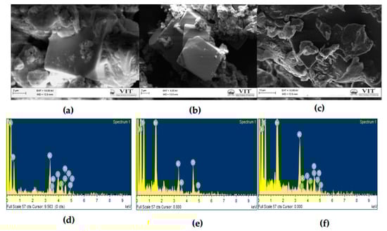 Further analysis of structure was carried out using SEM and EDX. Figure 2a,d represents SEM images and chemical composition of K2TiI6. It showed clusters made up of cube like grains. Figure 2b,e is the SEM and EDX of K2TiBr6, exhibiting irregular shaped structure which shows cubic grains on closer magnification. Figure 2c,f denotes the SEM and EDX spectrum of mixed halide perovskite K2TiI2Br4, which exhibits irregular, angular shaped flaky grains. A closer look at the SEM images shows non-porous grains, contrary to their cesium-based counterpart formed by the same method [31]. In addition, these perovskites are soluble in water. This quality opens many avenues for easy deposition process, in turn greatly helping to realize efficient thin film devices.